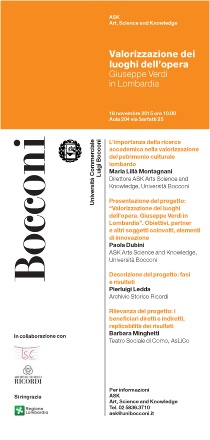 Il Centro di Ricerca ASK (Art, Science & Knowledge) dell'Università Bocconi, insieme ad Archivio Storico Ricordi e Teatro Sociale di Como (Associazione Lirico Concertistica Italiana; As.Li.Co), ha ottenuto un finanziamento di Regione Lombardia per sviluppare un progetto di valorizzazione del patrimonio storico lombardo.