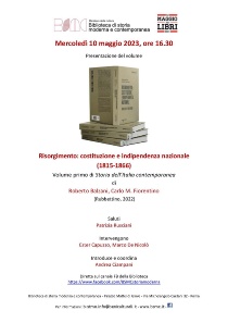 Mercoledì 10 maggio, alle 16.30, nell’ambito del «Maggio dei libri 2023», presso la sede e sul canale Facebook della Biblioteca di storia moderna e contemporanea, sarà presentato il primo volume della serie Storia dell’Italia contemporanea dal titolo Risorgimento: costituzione e indipendenza nazionale (1815-1866) di Roberto Balzani e Carlo M. Fiorentino (Rubbettino, 2022).
