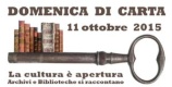 Domenica di Carta 2015: la Cultura è apertura L'11 ottobre 2015, Biblioteche e Archivi aprono al pubblico per una giornata dedicata a conoscere i luoghi storici della memoria ed il patrimonio in essi contenuto: ogni anno un appuntamento che si rinnova per scoprire il sapere fatto di libri, documenti, fotografie, stampe, disegni. Tante le iniziative che, distribuite in tutta la Penisola, accolgono studiosi e cittadini, adulti e bambini alla ricerca di fonti dirette