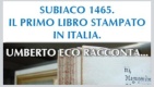 Subiaco 1465. Il primo libro stampato In Italia. Umberto Eco racconta… Quest’anno ricorre il 550° dell’introduzione della stampa in Italia e della nascita dell’editoria, di cui si sottolinea la grande validità culturale in termini non solo di mutamento delle comunicazioni scritte, ma anche di circolazione delle idee e dei processi di alfabetizzazione. Per ricordare l’avvenimento, sono diverse le iniziative culturali ed editoriali che si svolgeranno fino ad ottobre a Milano e Subiaco